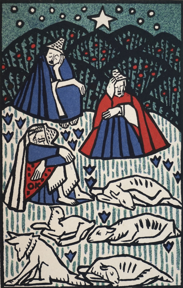 Drei Hirten, Hund und Schafe, Wiener Werkstätte Postkarte Nr. 116